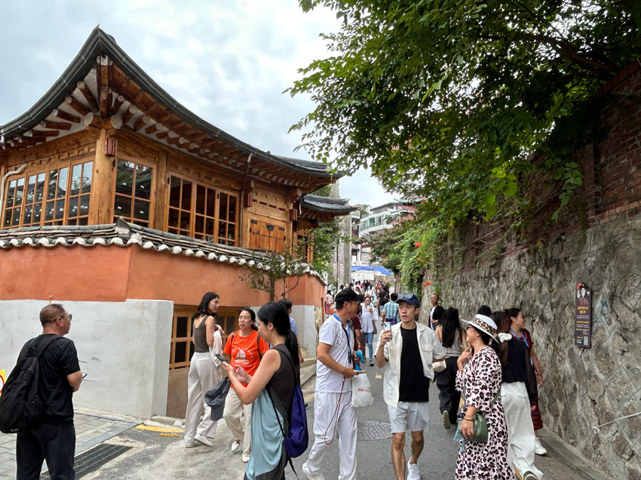 北村位于首尔清溪川和钟路以北,因此得名。如今,漫步在狭窄的小巷中,每一步都仿佛踏在历史的回声里。青瓦覆盖的屋顶、古朴的木门,以及那些在岁月中沉淀下来的传统建筑,无不让人沉醉于朝鲜时代的氛围之中。