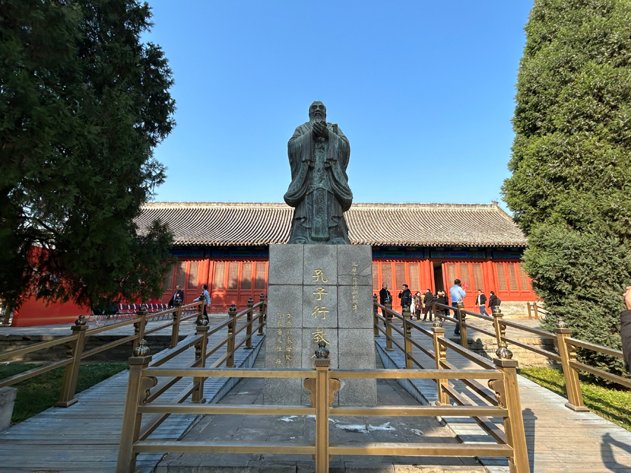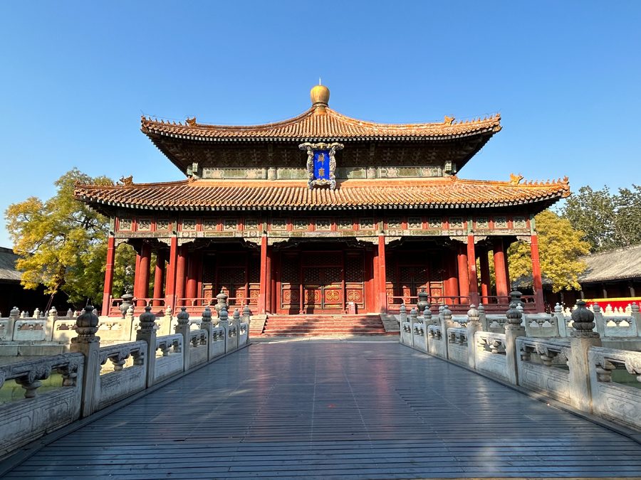 绕到辟雍殿前,一池秋水静得能照见云影。这方曾用于皇帝讲学的辟雍,环水而建,形制独特。想象当年,皇帝端坐殿中,官员与学子跪于殿外,通过传胪官逐层传诵聆听圣训的场景——连听课都如此"费劲",难怪说"必须鸦雀无声,精力集中"。如今池水依旧,只是再不见当年的盛景,唯有几尾锦鲤悠然游弋,搅碎一池秋光。