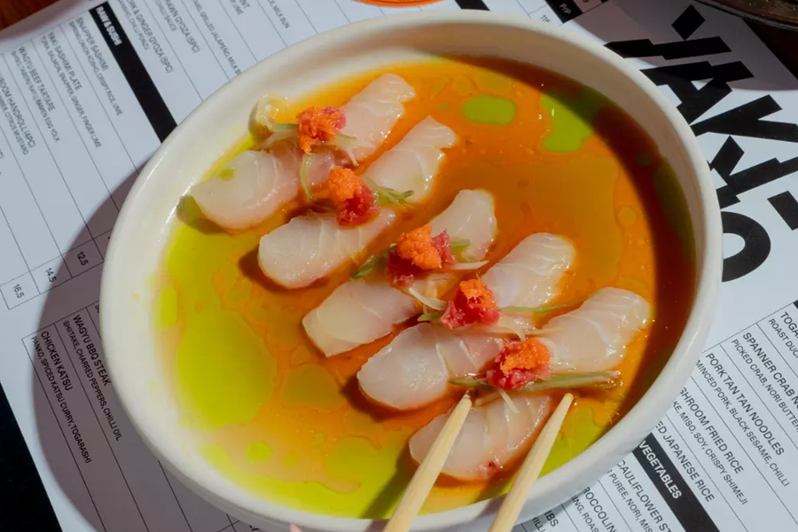 我最终落座于Yakimono的开放式厨房前。蓝色火焰在主厨翻动和牛时窜起,像夏日闪电;烤狗的焦香混着wagyu油脂的甜润,配一口荔枝那霸鸡尾酒,果肉在舌尖化开的微妙酸度,让115澳元约合(人民币539元)一位的套餐显得近乎奢侈。走出餐厅时,我不由自主地说,好吃是好吃,但是真的贵啊。