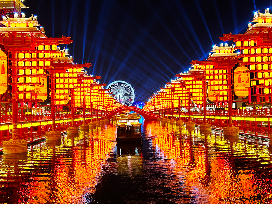 宫灯璀璨倒映流水,仕女图在灯影中婉约低眉,亭台楼阁与小桥连廊在波光里摇曳成诗。我忽然读懂了“唐山很唐”这四个字的重量。