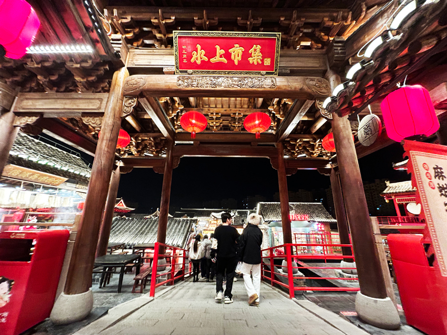 水上市集最是烟火气十足。百余种特色美食汇于悬浮摊位:小山炸糕的甜香、秘制柠檬水的清冽、各色网红小吃的诱惑。摊主们身着唐装,连吆喝都带了几分古韵。我买下一块热腾腾的炸糕,甜蜜在舌尖化开,忽然觉得,这大概就是幸福的味道。