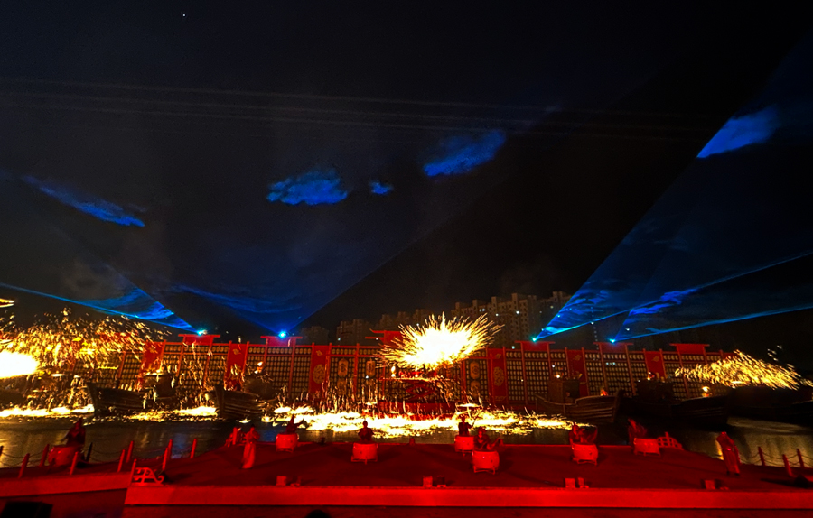 更惊艳的是"凤凰飞天"。唐装舞者被威亚吊起,乘着巨大凤翼凌空起舞,撒下的花瓣在灯光下泛着晶莹光泽。岸上游客纷纷举起手机,却又屏息凝神,生怕惊扰这场穿越千年的瑰丽梦境。