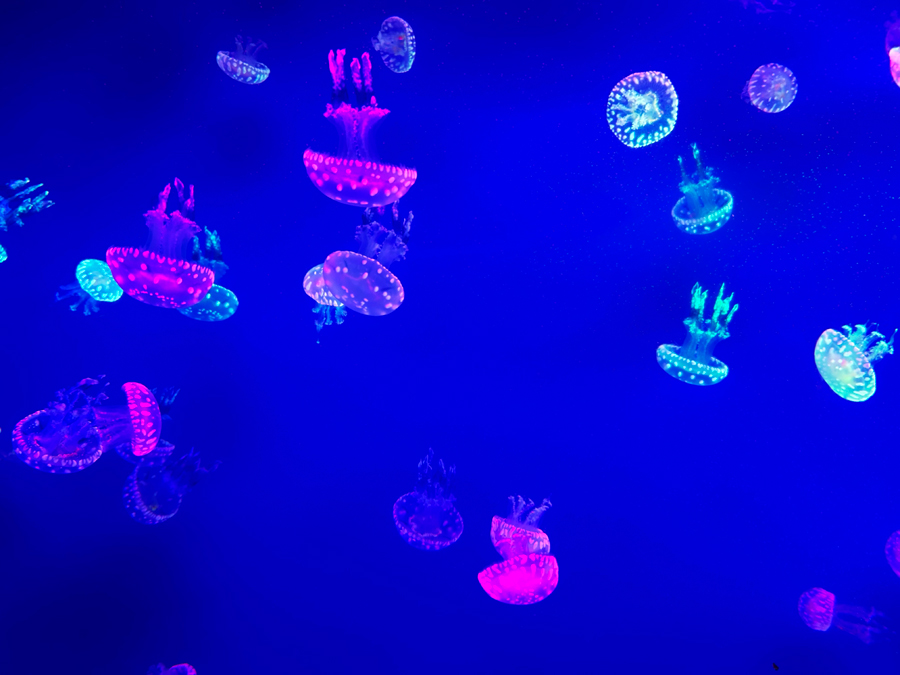再往深处走,水母宫幽光浮动,那些半透明的精灵在特制灯光下缓缓开合,如宇宙初生的星云,又似无声的呼吸,在深蓝背景里浮游着一种近乎神性的静谧。它们无骨无依,却以最柔韧的姿态,在人类目光的注视下,演绎着生命最原始而恒久的律动。
