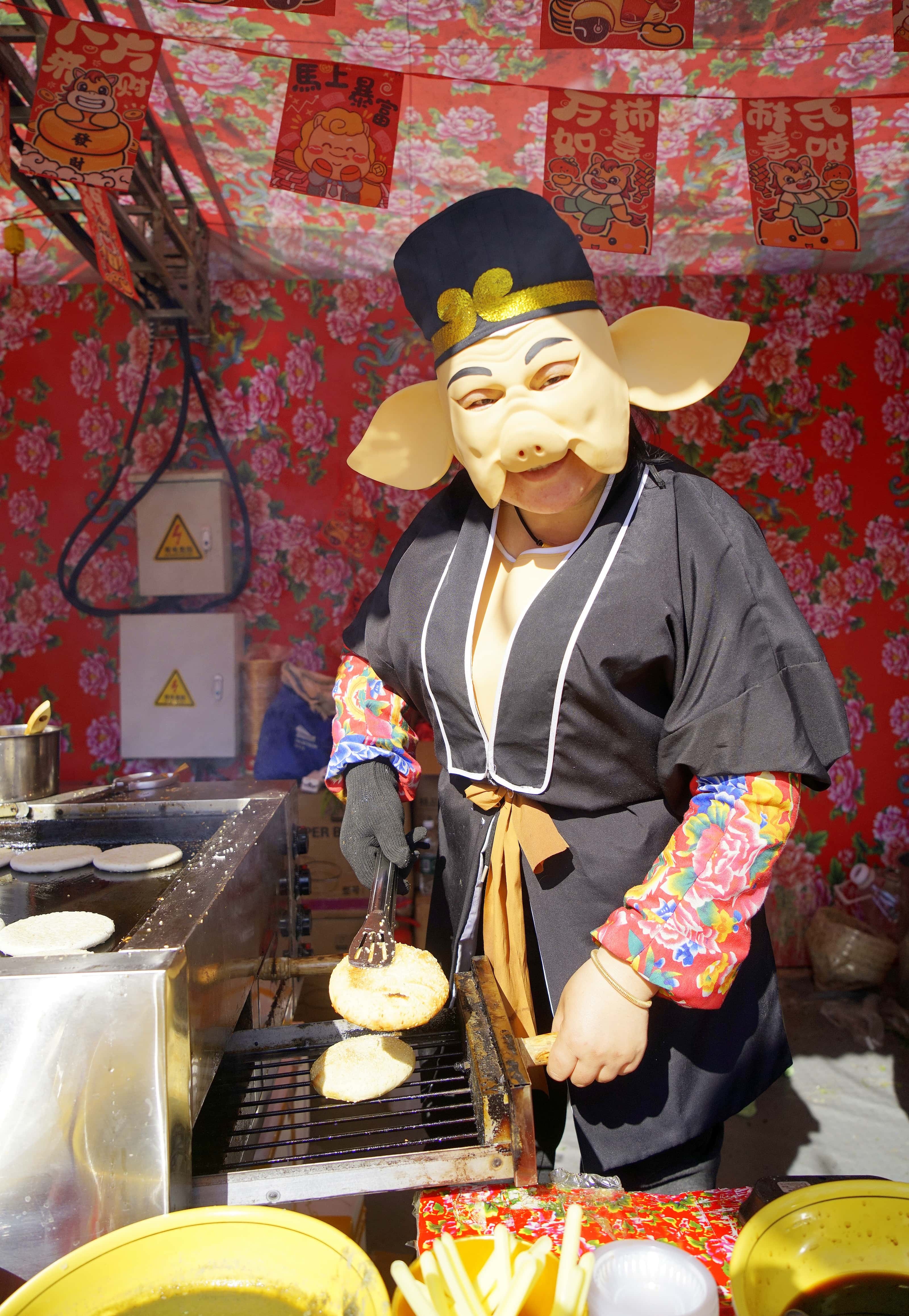 烟火气满满的美食街更是诱人味蕾,老北京卤煮、河南吊炉烧饼羊汤、广东肠粉、重庆酸辣粉、台湾蚝蛋烧等各地特色小吃一应俱全。最吸睛的当属“激情烤肉大串”摊位,小伙儿边烤串边热舞,活力满满感染全场;憨态可掬的“猪八戒”现场出炉烧饼,一秒上演《西游记》片段,趣味十足。