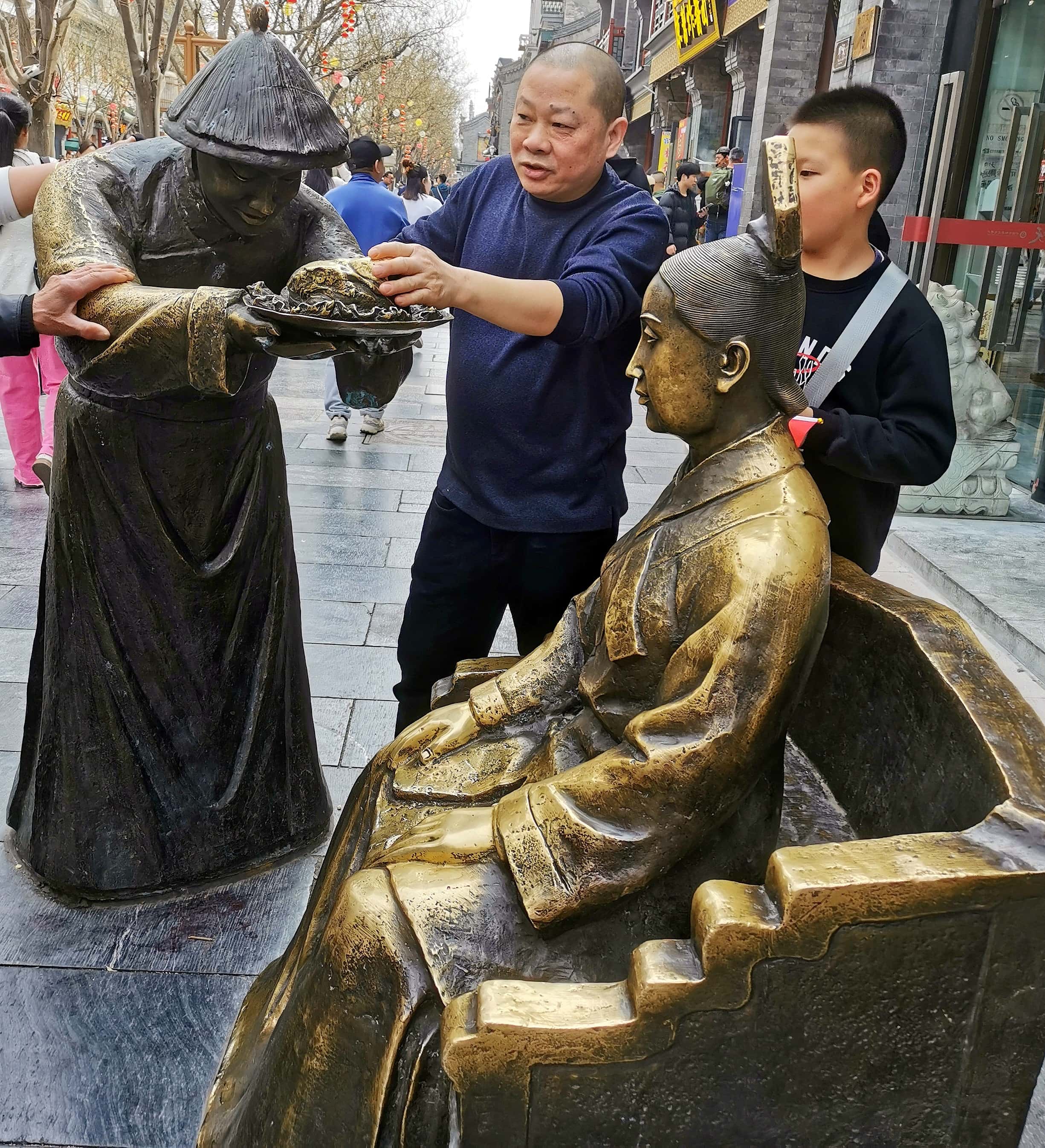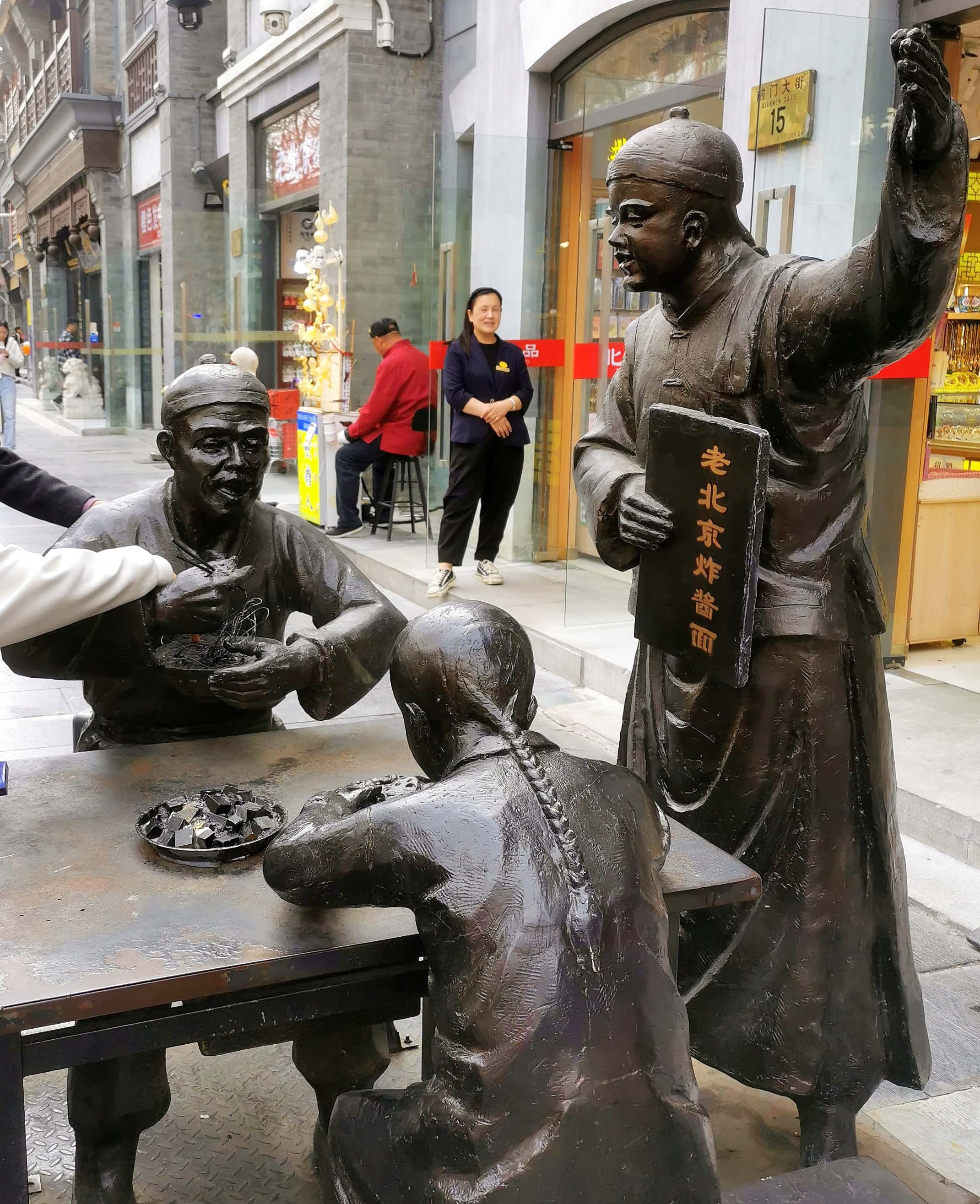 除了特色体验,大街上的时代感雕塑也是点睛之笔。不少商铺门前的人物雕塑,生动还原了老北京人的生活场景,或闲谈、或劳作,鲜活再现了旧时京城的烟火气息,让游人在观赏中读懂前门的历史过往。