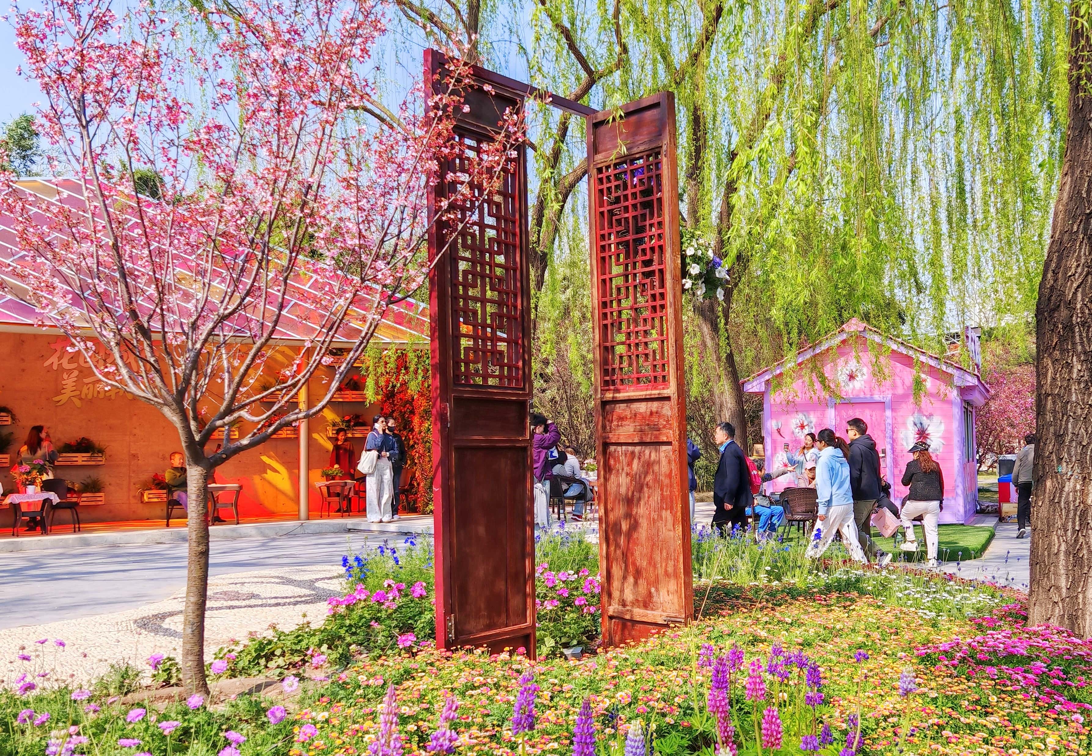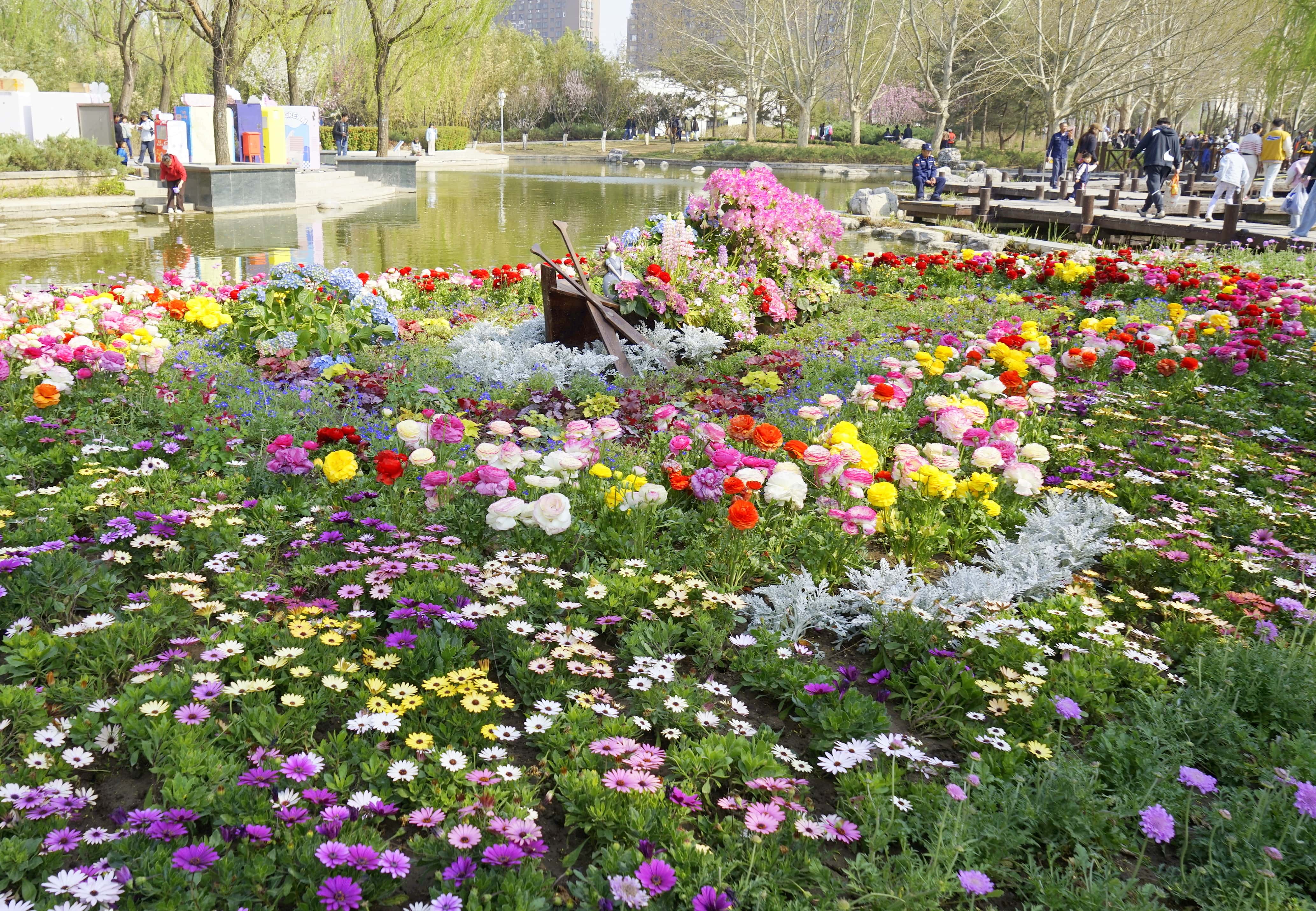 北小河公园春日繁花盛开,市民赏花、拍照、休闲,营造出惬意春日氛围。
