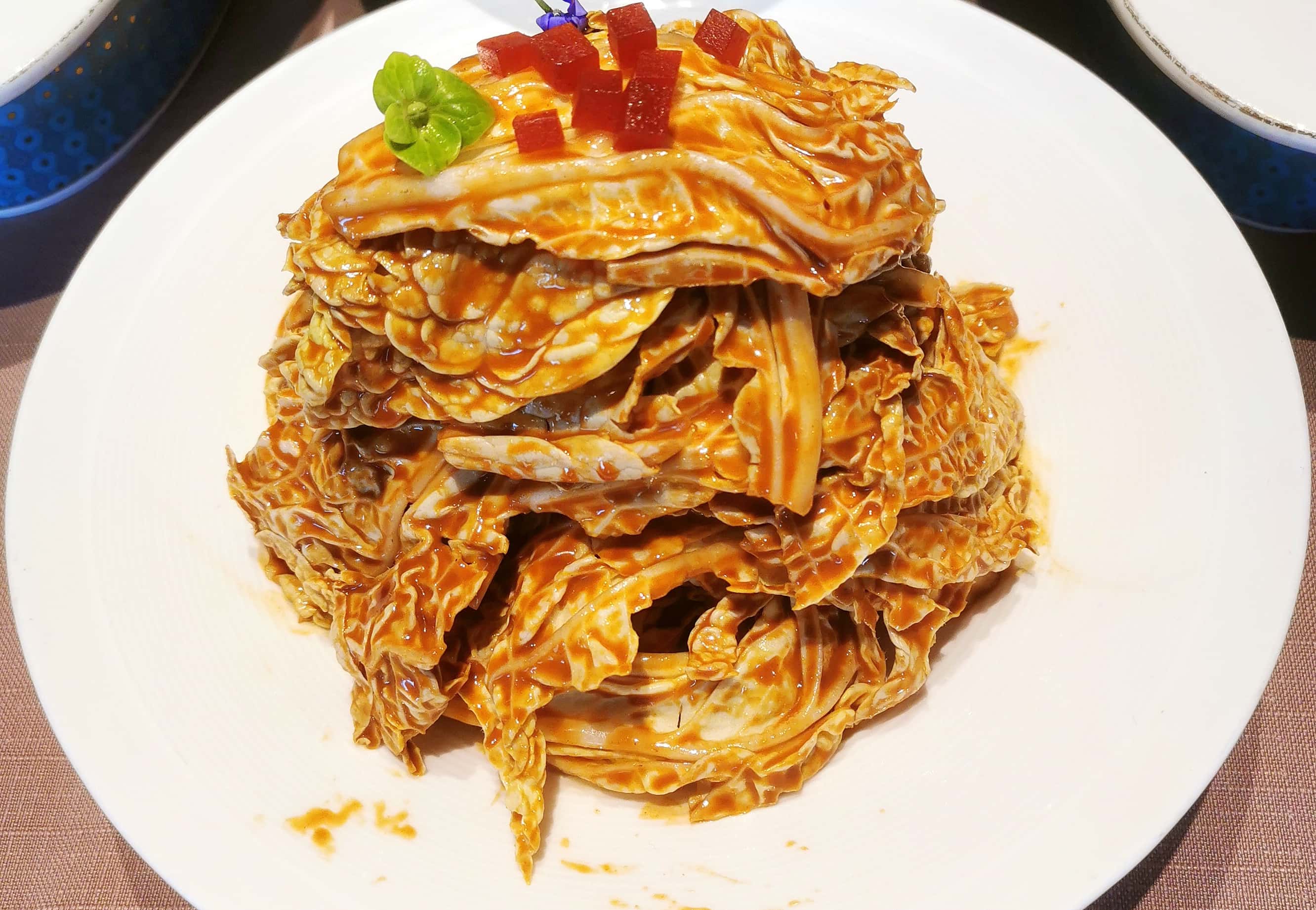 他家的春饼更是特色十足,薄如蝉翼却筋道不破。按经典吃法,卷上焦脆鸭皮、鲜嫩鸭肉,搭配葱丝黄瓜条与甜面酱,焦香、酱香交织着蔬果的清爽,满口都是地道京味。大胆尝试新吃法,用拌好的乾隆白菜替代黄瓜条卷饼,酸甜脆爽碰撞烤鸭醇香,滋味独特又惊艳。