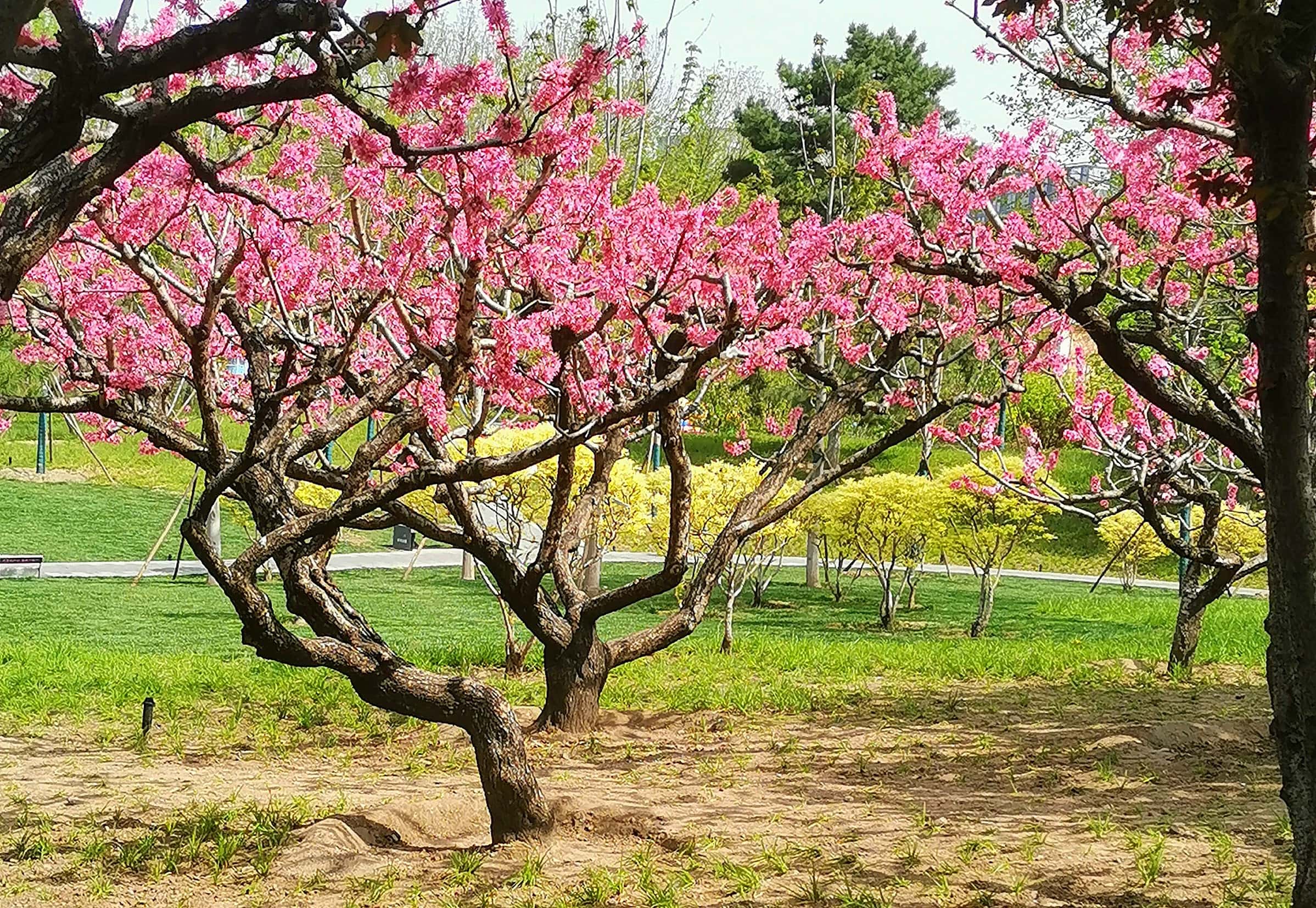 春日里,园内樱花烂漫、蔷薇娇艳、丁香芬芳,处处生机盎然。尤其是山坡上的丁香花区,微风拂过,浓郁的花香沁人心脾,漫步其间,让人沉醉不愿离去。登上山坡观景台,放眼望去,园内繁花似锦,远处CBD的摩天楼宇与高架桥错落矗立,自然野趣与都市繁华相互映衬,风光格外赏心悦目。