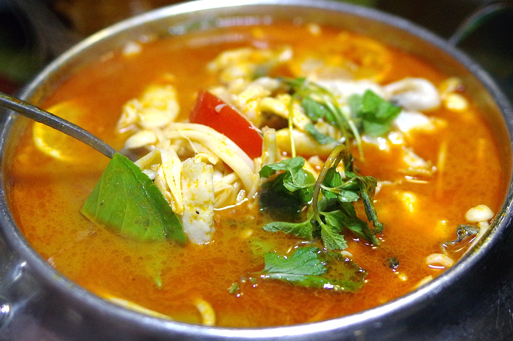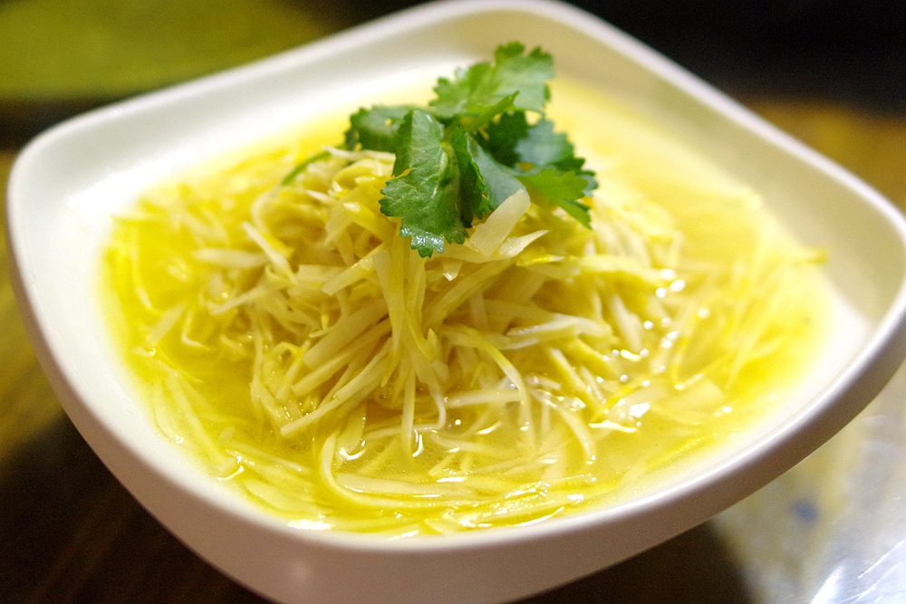 香茅鱼片:卖相跟厦门流行的沙茶汤有点像,口味明显带有泰式的酸辣,除了鱼片,配菜很丰富,也是兼顾口感和味道丰富协调的思路。