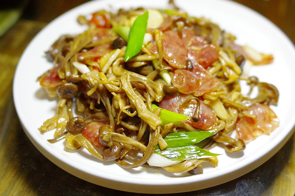腊味鹿角菌:家常炒法,所谓鹿角菌我还以为是什么特别的菌菇,吃起来觉得跟茶树菇很接近。