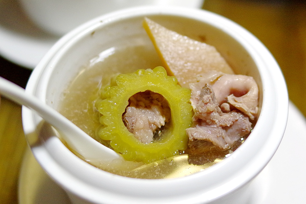 苦瓜螺片汤:这是一罐内容丰盛,回味悠长的汤。猪肝沿,肉茸和鲜螺片共同赋予了汤味醇厚的鲜美感觉,苦瓜的参与回甘效果明显,不同食材各自有滋有味性格鲜明。值得力荐!