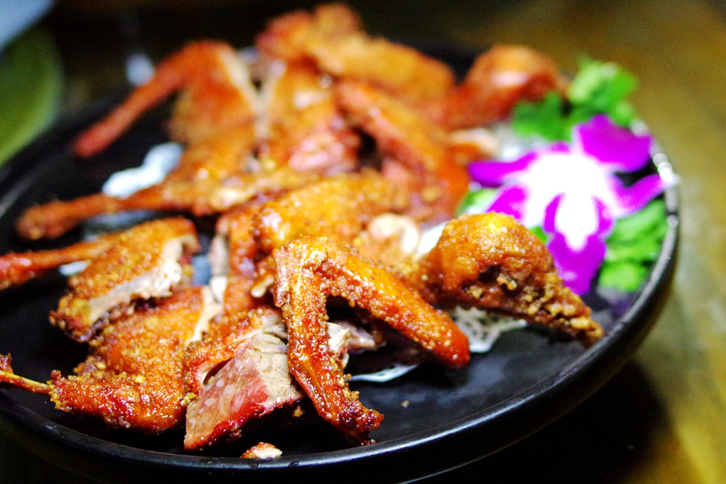 糟香酥皮鸽:应该就是把福州传统菜糟香鳗用鸽子偷梁换柱,不过这么一来倒也有意思,既不像吃惯了的油淋乳鸽,形色和质感又和鳗鱼块差异甚大。