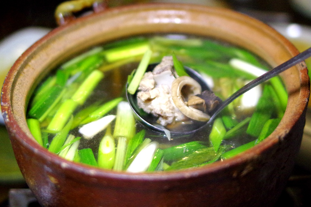中华醒汤:朋友们个个都是酒国英雄,大家从平民版的酸辣汤,榨菜肉丝西红柿汤,到高级版的蒜子文蛤汤没少喝,这锅加了大量青蒜苗的龙骨螺头汤也有醒酒功效?