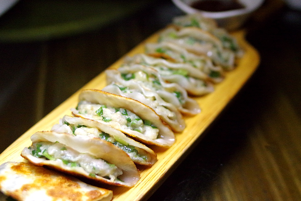 水饺烧:别扭的名字。看着是像半拉饺子,两面煎过后,往案板上一摆,又像锅贴。“我们家的师傅不会包饺子,勉为其难弄成这个样子。”梳着晚期遗老独特发型的老板尴尬地说。哈哈哈,这样也行!
