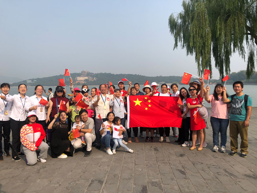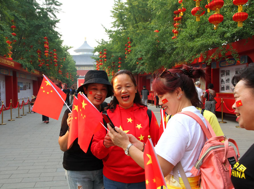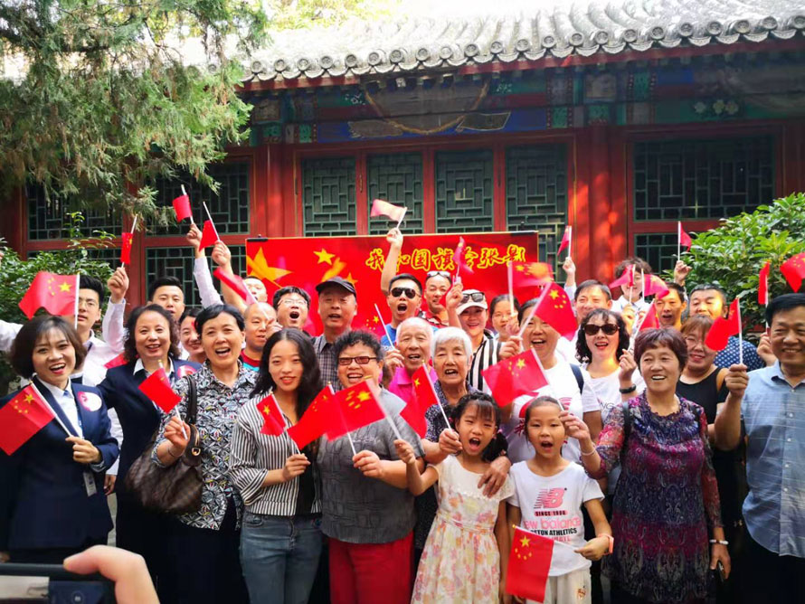 在颐和园,游客朋友们通过合影、绘画、留言的形式,在昆明湖畔绘国旗,在古建筑群前和国旗合影,向祖国寄心声。来自湖北、河南、广西、青海的近30名游客一起在昆明湖畔合影,齐声高呼:“我爱你,中国”。向祖国表白,诉说对祖国的无限热爱。