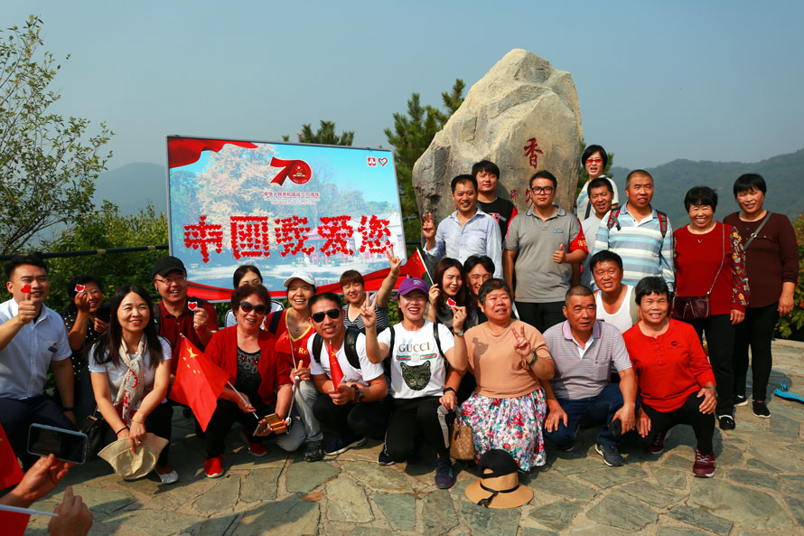 香山公园内,在香炉峰京城最高的志愿服务岗,工作人员和游客们共同在背景板上张贴“一颗心”,拼成“中国我爱您”,表达中华儿女心向祖国的情怀。
