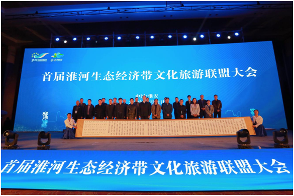 一曲悠扬的《淮水谣》唱出淮河两岸人共同的情思,在联盟成立大会上,与会领导共同启动联盟成立仪式,以取自5省的淮河水点亮淮河及沿淮城市,见证淮河生态经济带文化旅游联盟的腾腾升起。25市县文旅部门负责人共同发布了联盟宣言,宣告联盟成员将凝聚共识、加强合作、共建平台、深化交流、市场互通、客源互济,通过共同创办文化艺术交流基地、培育精品旅游线路、开发特色旅游产品,举办文旅博览会、文化巡演、旅游推介活动,推动文化演艺团体、旅游景区、星级饭店、旅行社、旅游服务企业对接等,带动淮河生态经济带文旅全域联动、创新发展、消费升级。会上,联盟分别与中道旅游集散联盟、南京旅游学院、淮阴师范学院签署了关于共同打造“淮河号”旅游直通车、淮河生态经济带文化旅游联盟旅游人才培养的战略合作协议。会上还确定安徽蚌埠为第二届联盟大会举办城市,并进行了授旗和赠画仪式。