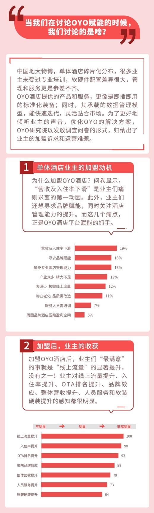 为什么加盟OYO酒店?问卷显示,“营收及入住率下滑”是业主们痛则求变的第一动因。此外,业主们还想寻求品牌赋能,同时关注酒店管理能力的提升。而这几个痛点,正是OYO酒店平台赋能的抓手。