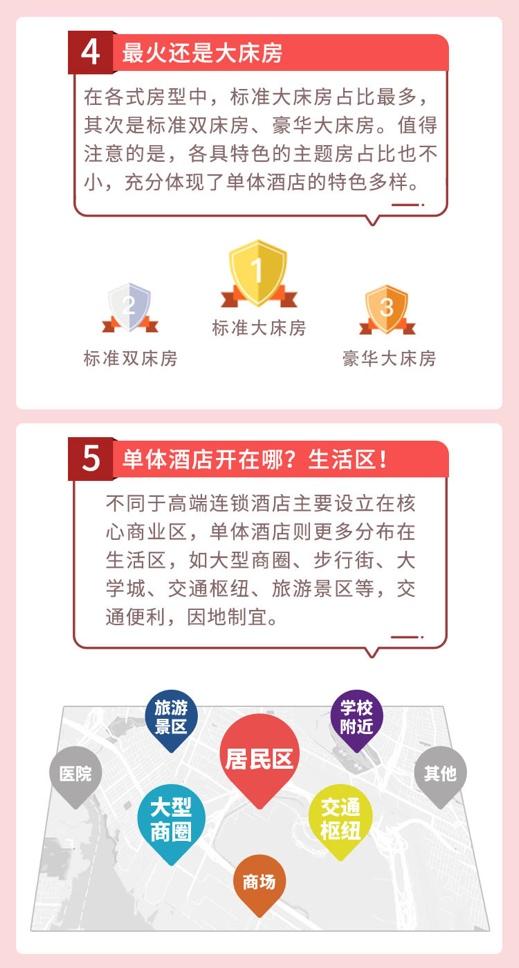 就地理位置来看,不同于高端连锁酒店主要设立在核心商业区,单体酒店更多分布在生活区,如大型商圈、步行街、大学城、交通枢纽、旅游景区等,这些地方大多交通便利,酒店选址因地制宜。