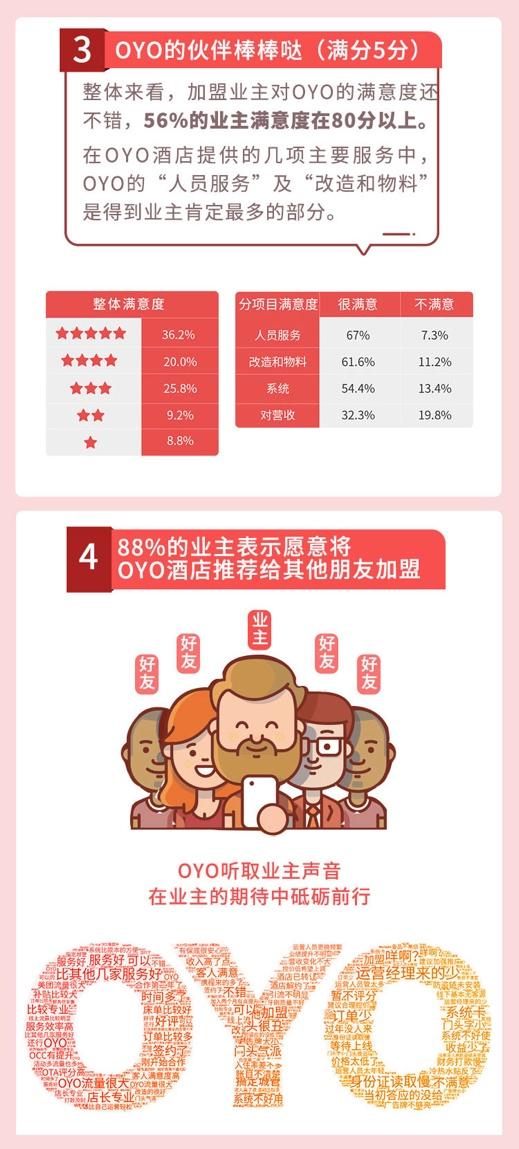 在OYO酒店提供的几项主要服务中,OYO的“人员服务”、“改造和物料”和“酒店管理系统“是得到业主肯定最多的部分。而88%的业主加入OYO酒店后,表示愿意将OYO酒店推荐给其他朋友加盟。