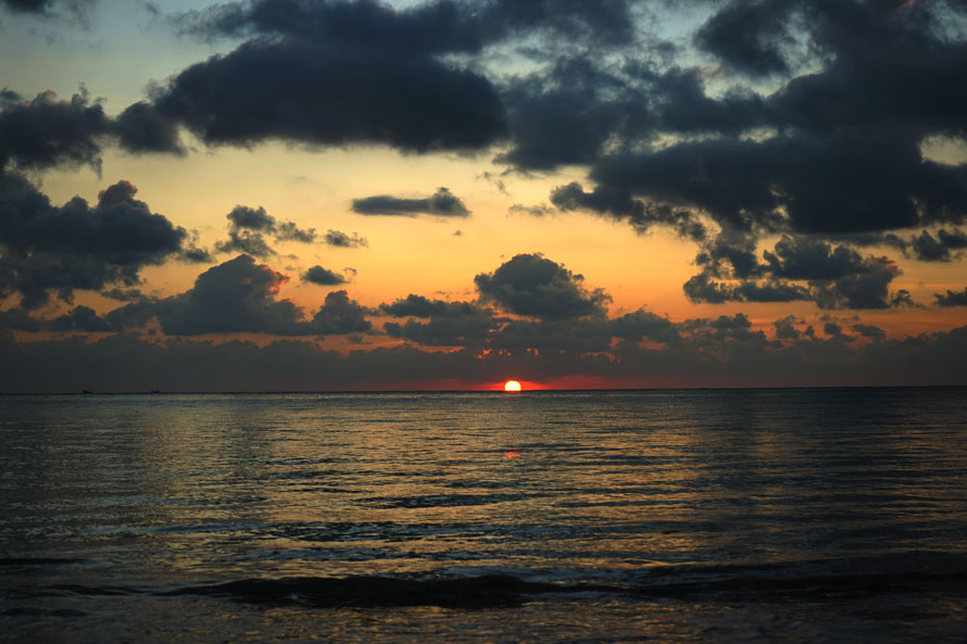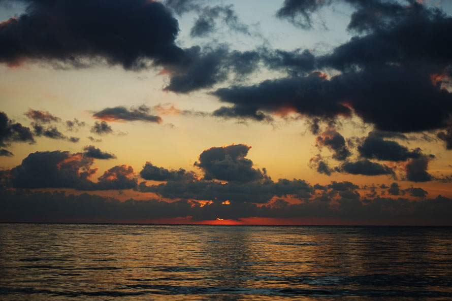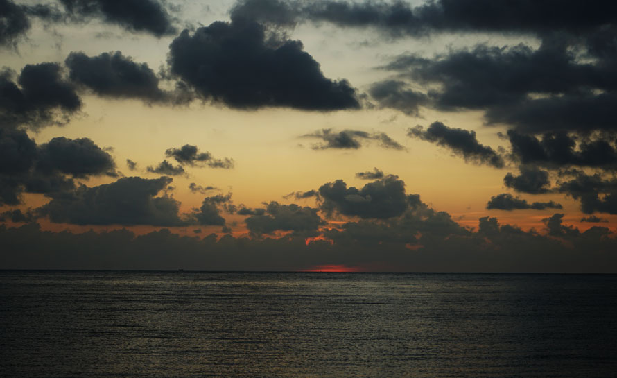 初时,大海尽头一线红,墨色的云已被渲染。