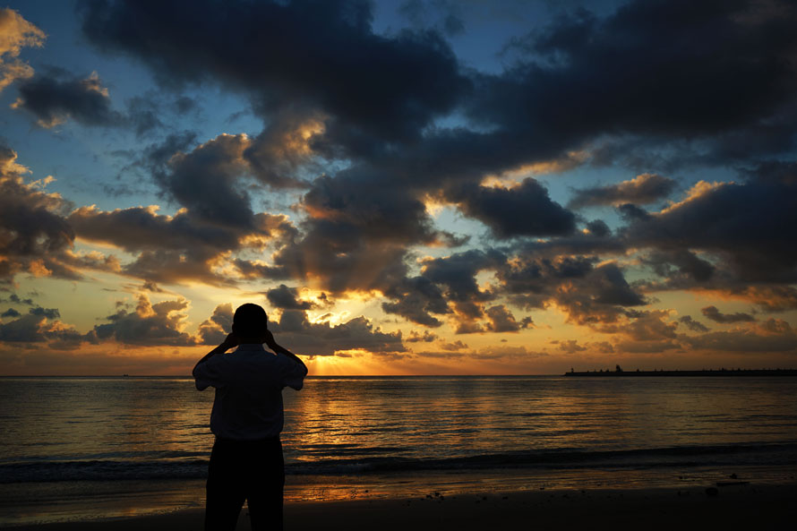 清晨,琼海边的游客在沐浴朝阳,并留下这日出片刻