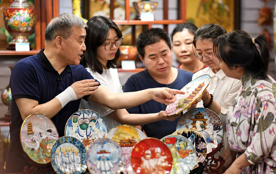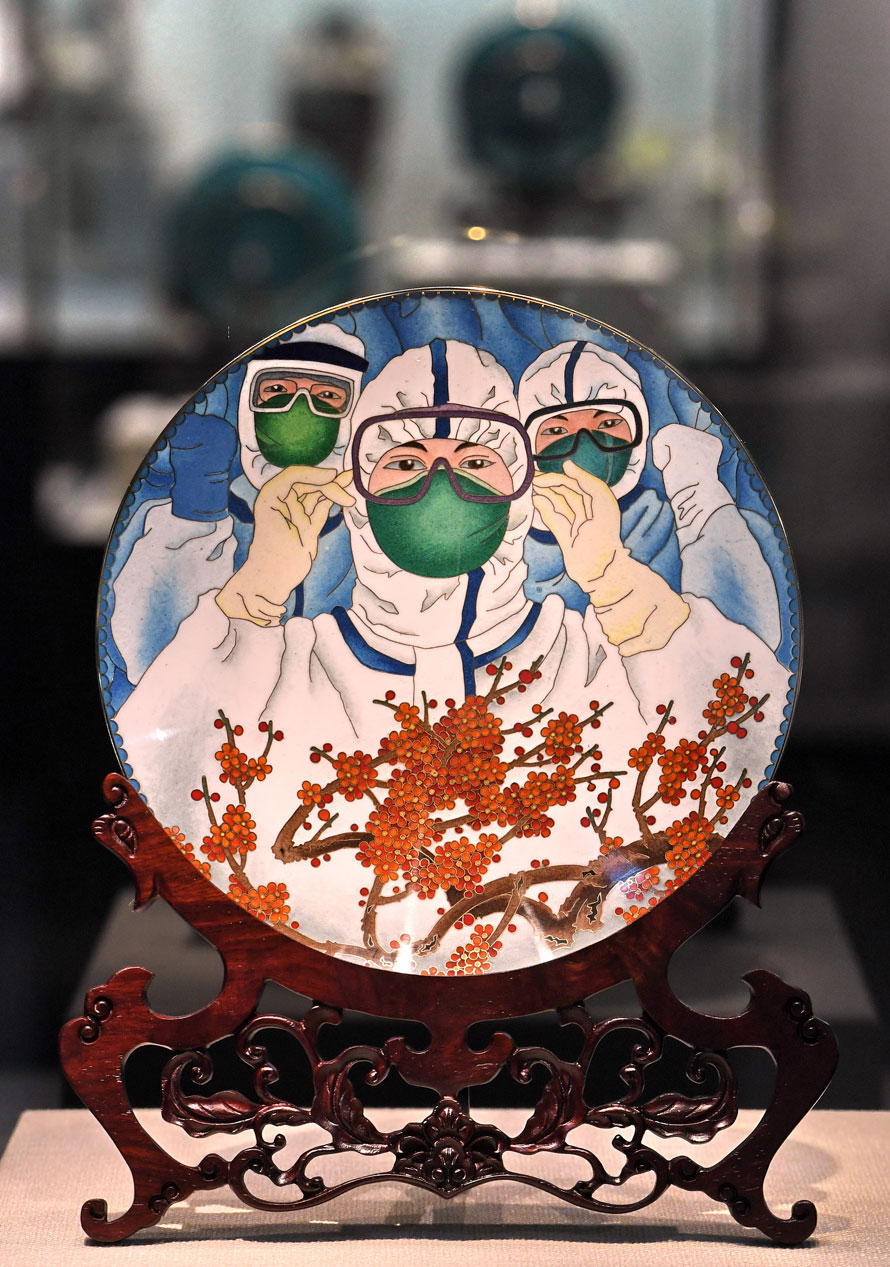 景泰蓝艺术作品内容展示了广大党员、各地医务工作者各行业基层工作人员、武汉人民和全国人民众志成城抗击疫情的感人瞬间。