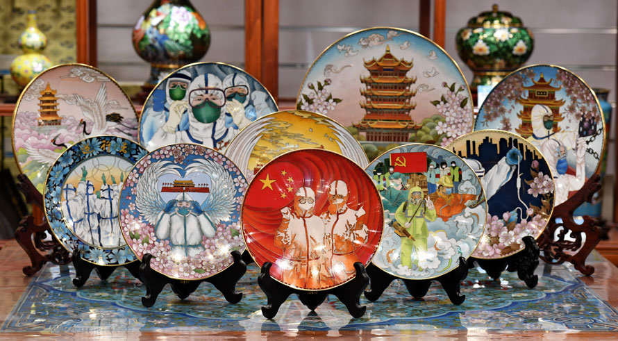日前,由国家级工艺美术大师钟连盛带领北京珐琅厂七位工艺美术技师共同创作了《众志成城 抗击疫情》系列景泰蓝艺术作品在京亮相。