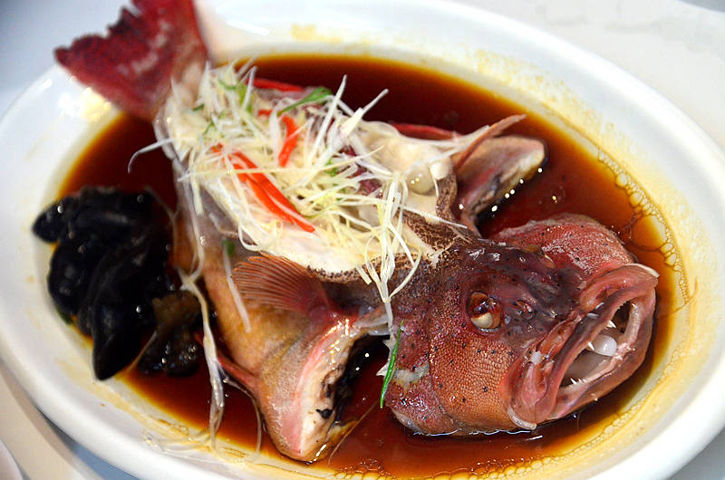 东星斑,这是石斑鱼的一种,皮红肉白,肉质娇嫩细腻,滋味鲜美,酱油水的咸香更突显鱼肉的美味。