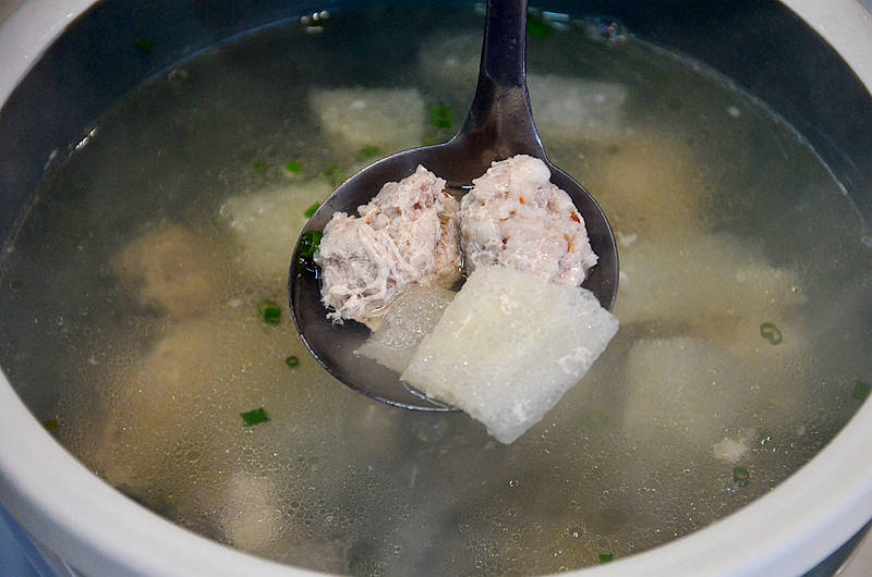海蛏干炖肉茸,汤中有好多海蛏干、肉丸和竹荪,真材实料,汤汁清而不淡,浓而不腻,连料带汤热乎乎吃上一碗,十分舒畅。