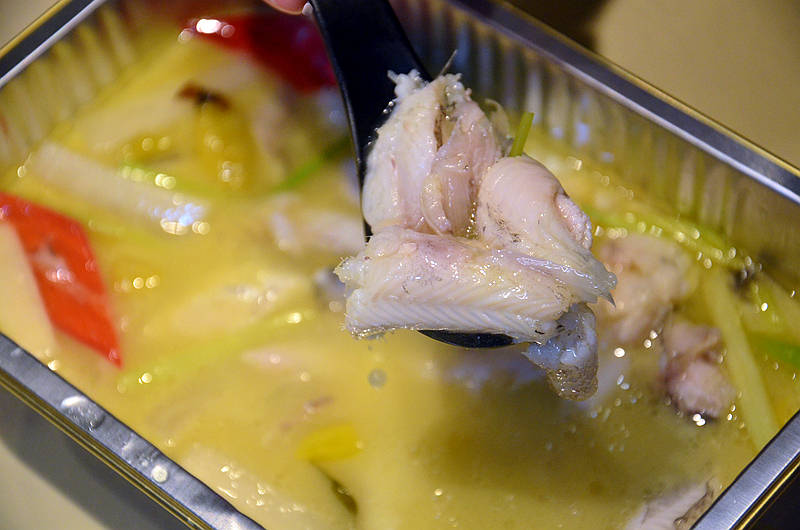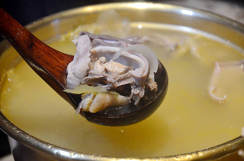 阿季猪肚鸡,锅中有好多的鸡肉、猪肚,诚意满满,汤汁浓郁醇厚,吃肉喝汤,捞的干干净净还意犹未尽。
