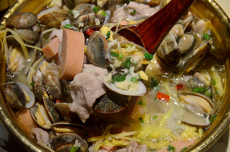酸汤花蛤,满满一锅的花蛤、午餐肉、肉片等食材,真材实料,酸爽的滋味更突显食材的鲜美,画龙点睛。