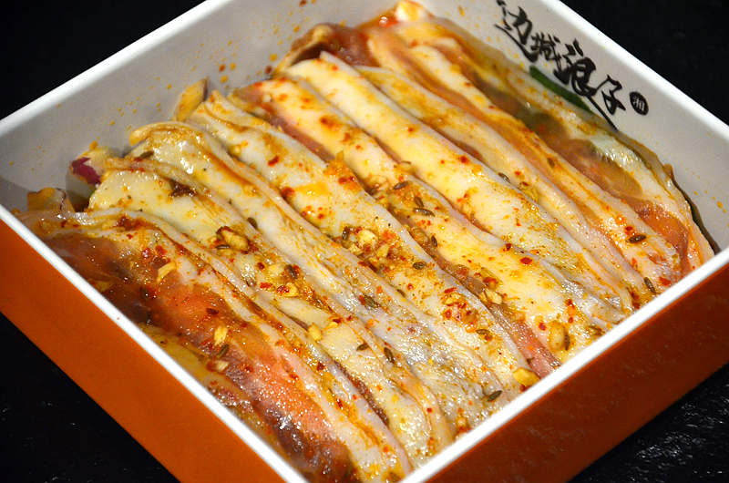 招牌五花肉,这是一道必点的招牌菜,肉片大小厚薄均匀,肥瘦得宜,迫不及待放上烤盘,展开铺平,接受炭火的洗礼。