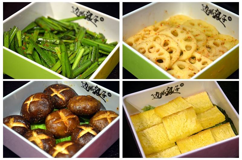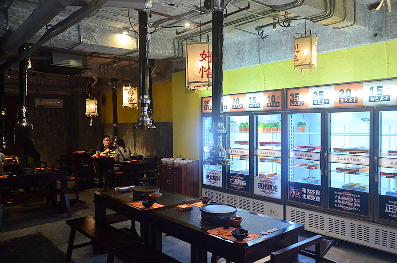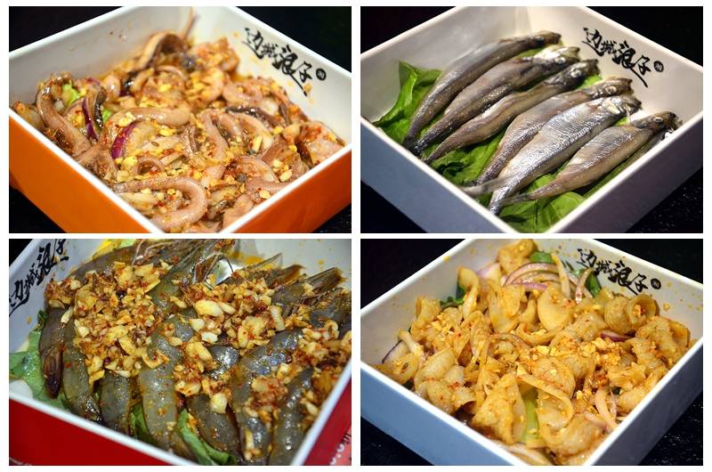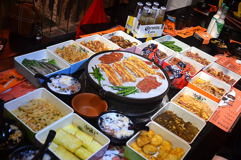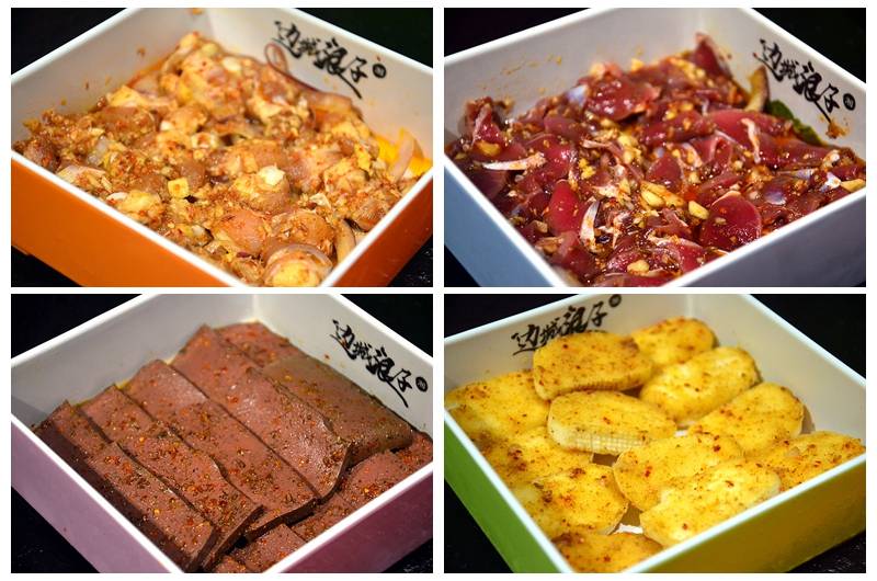 主打湘派烤肉,采用自助形式,各种食材盛放在不同颜色的盘子里,分门别类放在冰柜中,自助拿取,所见即所得,最后按盘子的颜色和数量计价,十分有趣。