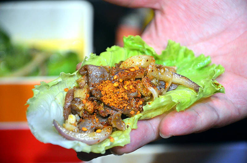 烤熟后直接送入口中,或者蘸上蘸料吃,或者用生菜包裹着吃,怎么吃都好吃,回味无穷。