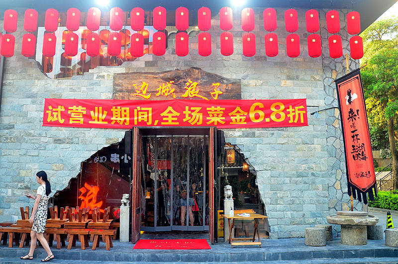 边城浪子位于明发百安居旁坡上去50米左侧,复古的外观,仿佛湘西的石寨,房檐挂着大红灯笼,十分夺目。