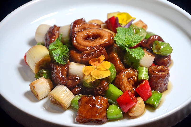 京葱安格斯牛肉,牛肉切成大块方形,搭配京葱烹制,一块入口,柔嫩有嚼劲,浓郁的肉香中带着京葱的清香,画龙点睛。