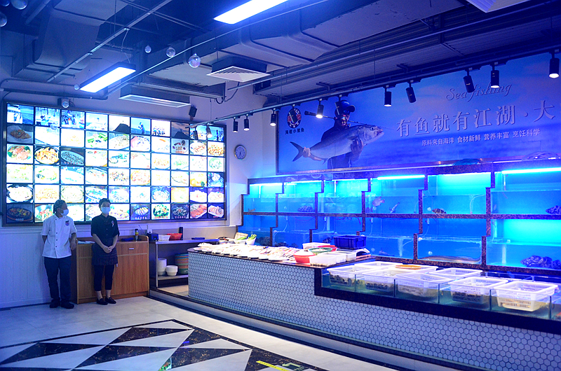 按厦门酒楼大排档的传统,进门就是大大的海鲜池,养着生猛海鲜,还有整面墙的招牌菜照片,看着海鲜和照片点菜,明明白白。
