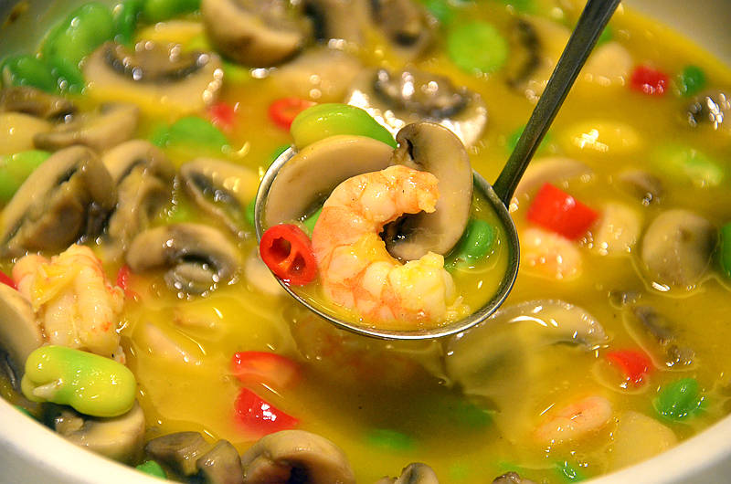 家烧蚕豆,现在正是蚕豆的季节,一颗颗绿油油的饱满清亮,加入虾仁、蘑菇烹制,清香鲜美,羹汤鲜美浓稠,吃的到春天原野的滋味。