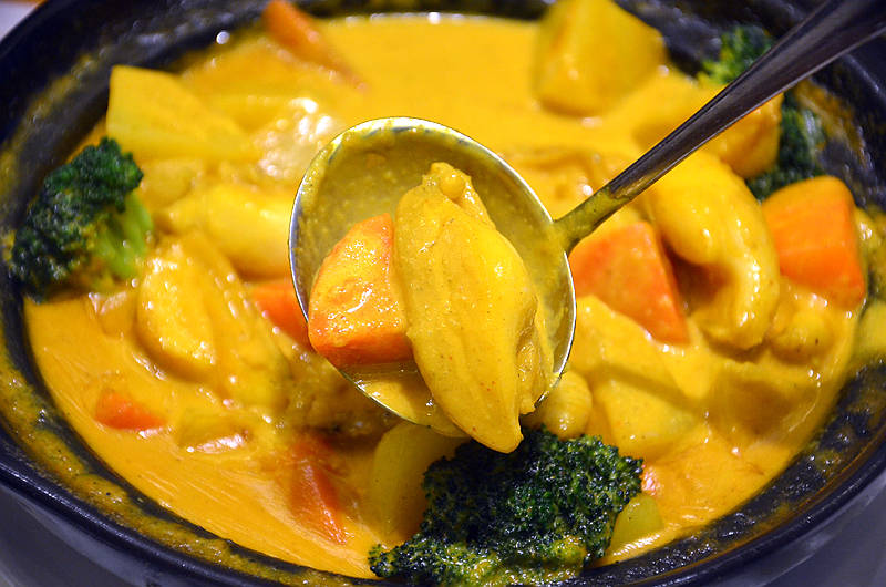 咖喱煮鲍鱼,鲍鱼紧实弹牙,本身的鲜美加上咖喱的香浓,锦上添花,用咖喱拌饭也是极好的。