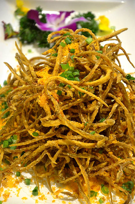 椒盐鳗鱼苗,金灿灿的很漂亮,一吃之下令人惊艳,香香脆脆,火候恰到好处,不生不焦,一会就被瓜分一空。