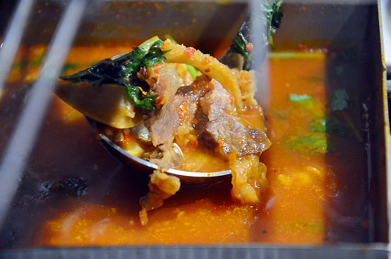 啤酒锅,锅中有好多牛杂,用秘制汤汁加上啤酒烹煮,肉香加上酒香,令人陶醉。