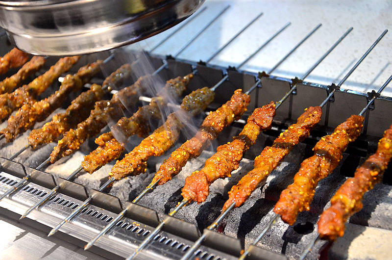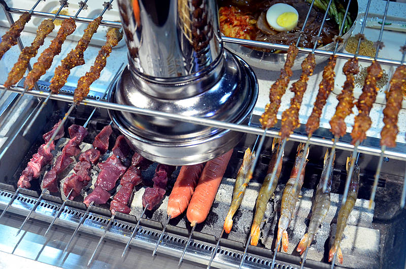 用木炭加热,火力刚刚好,烤架会自动左右平移,带动烤串翻滚,受热均匀,在眼前满满烤熟,香气四溢,十分诱人。