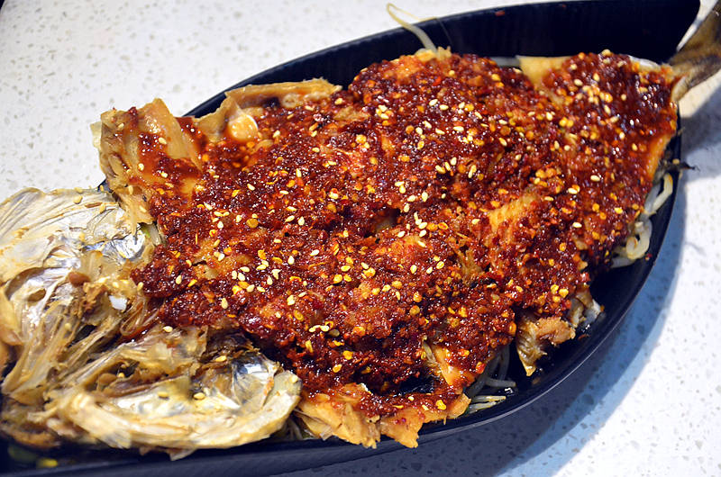 明太鱼蒸黄豆芽,鱼肉下垫着黄豆芽,鱼肉上抹着一层红彤彤的辣椒,鱼肉和豆芽一同送入口中,鱼肉鲜嫩,豆芽清脆,辣椒香辣,多种口感和滋味在口中融合,真是奇妙的体验,这道菜比较辣,不能吃辣的朋友慎点哦。