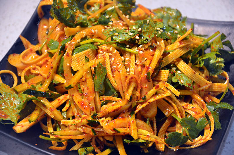 拌干豆腐,豆皮切成丝,加入延边风味的酱汁拌匀,有滋有味。