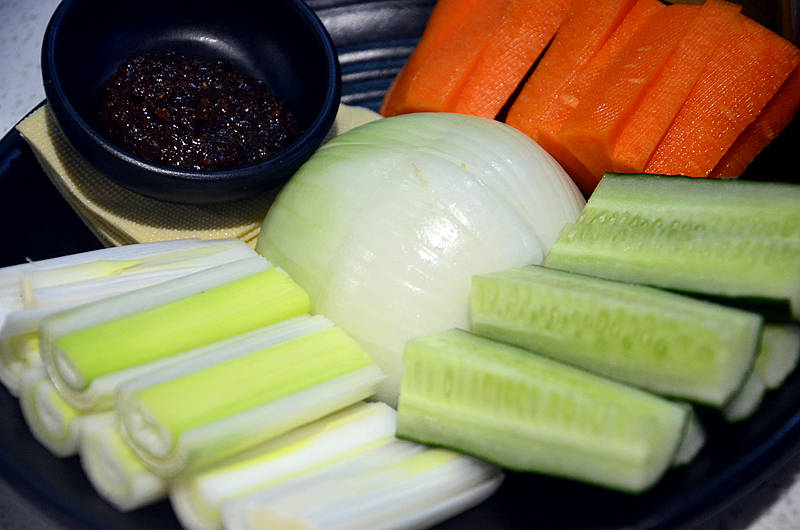 蘸酱菜,有黄瓜、胡萝卜、洋葱、大葱、豆皮,蘸着特色肉酱吃,口感味道绝佳,令人惊艳,一会就被瓜分一空。