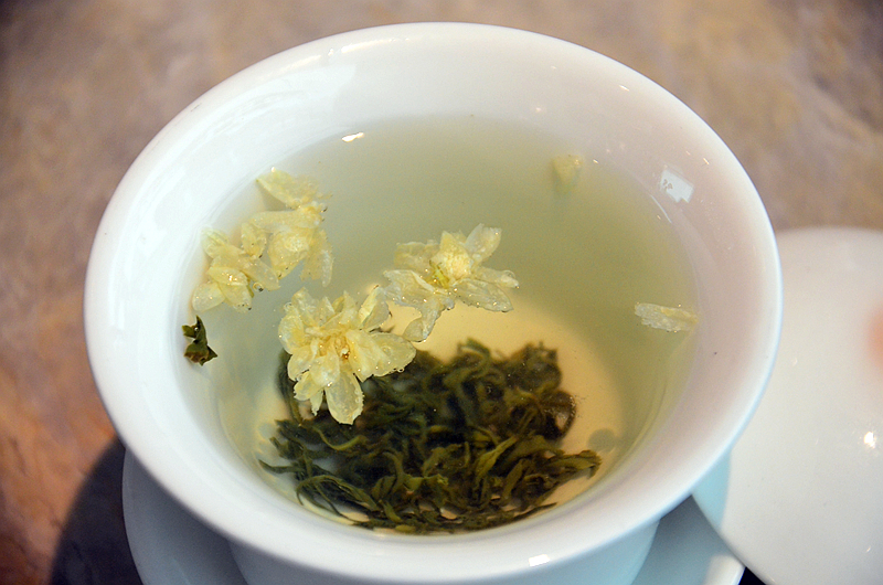 清茶一盏,茶香花香扑鼻,喝上一口,怡然自得。