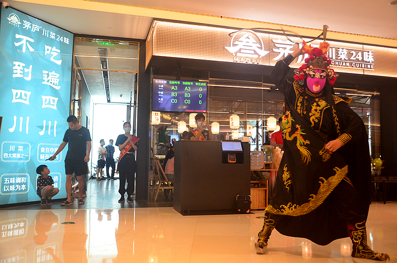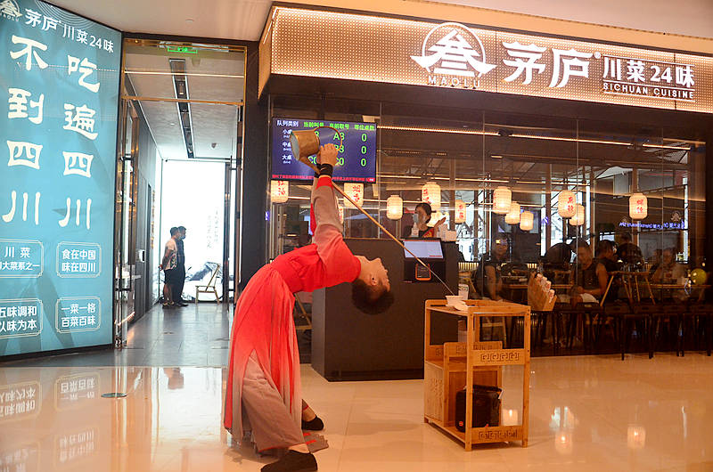 来到湾悦城四楼餐厅门口,正好赶上精彩的倒茶表演,俊朗的小哥穿着红色古装,英姿勃发,长嘴茶壶舞的上下翻飞,扣人心弦,叹为观止。
