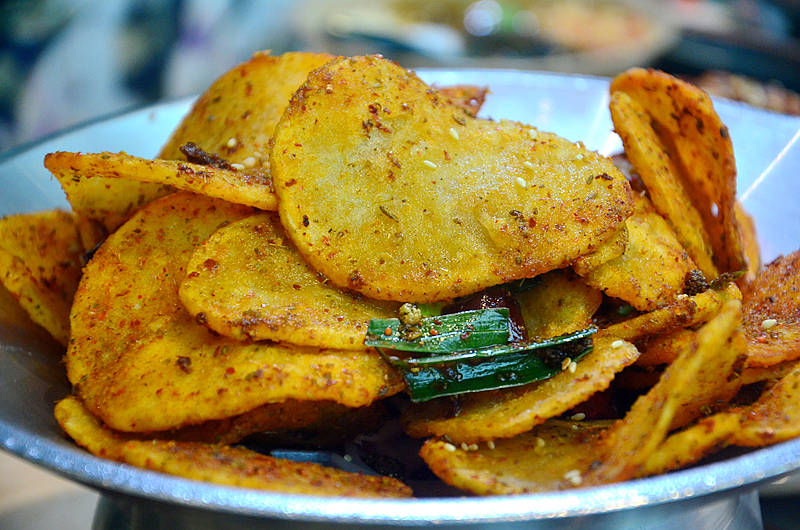 干锅土豆片,土豆片大小厚薄均匀,金灿灿的很漂亮,口感酥脆,滋味均匀,一会就瓜分一空。