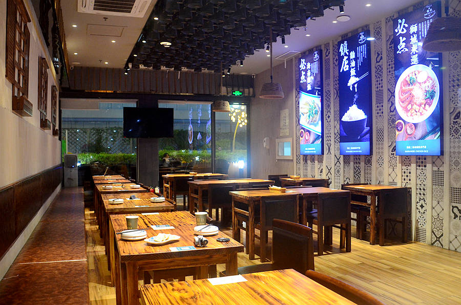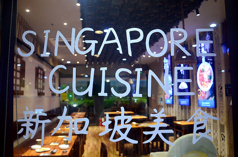 玻璃上贴着餐厅的主题:新加坡美食,店内亮晶晶,气氛温馨。